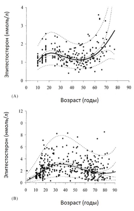В дальнейшем H. Havlıková et al. (2002) при изучении уровней эпитестостерона в крови не только у мужчин, но и у женщин в возрастном аспекте установили, что концентрации эпитестостерона в плазме крови зависят от возраста и составляет в среднем 2,5 нмоль/л у взрослых мужчин и 1,2 нмоль/л у взрослых женщин [14].